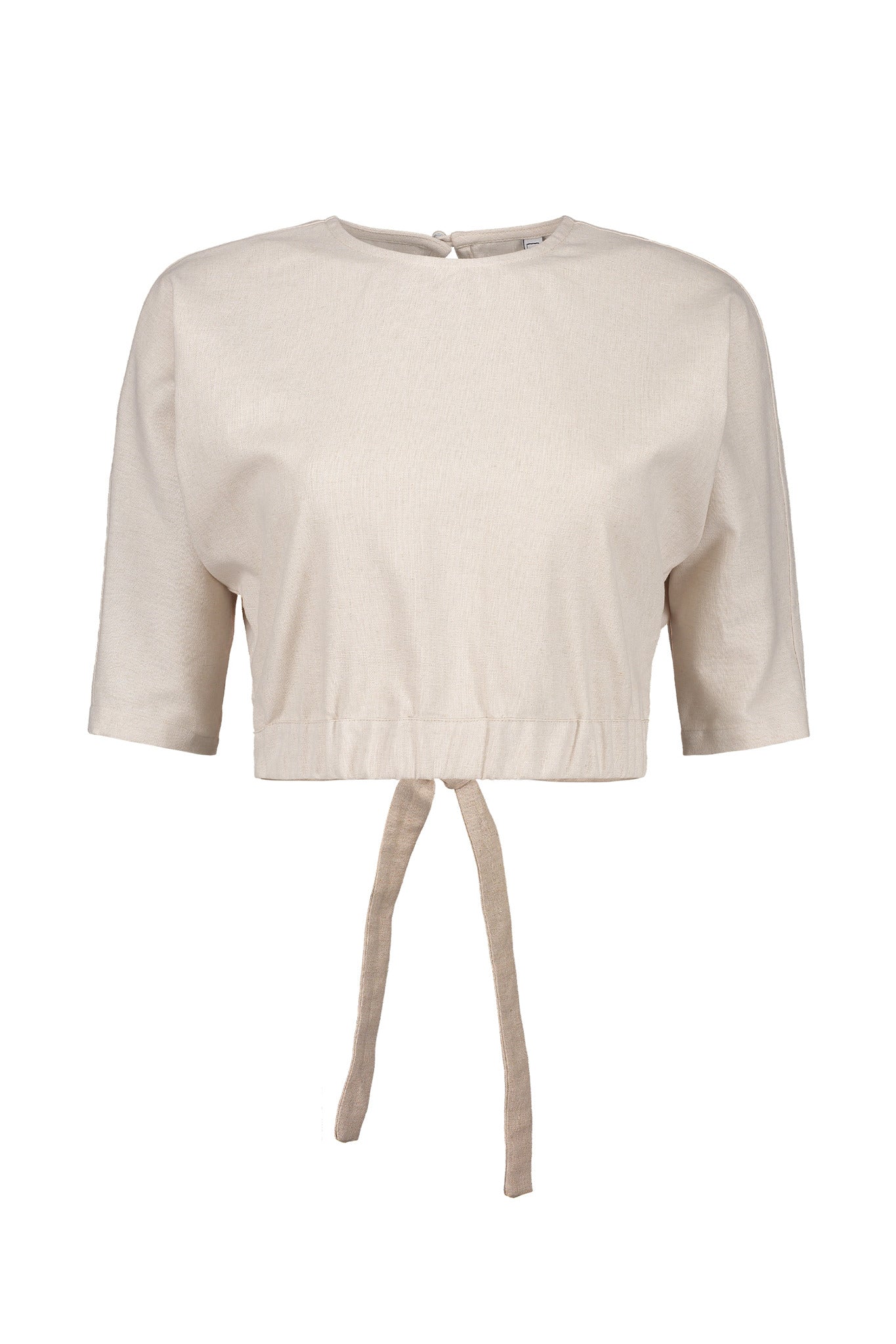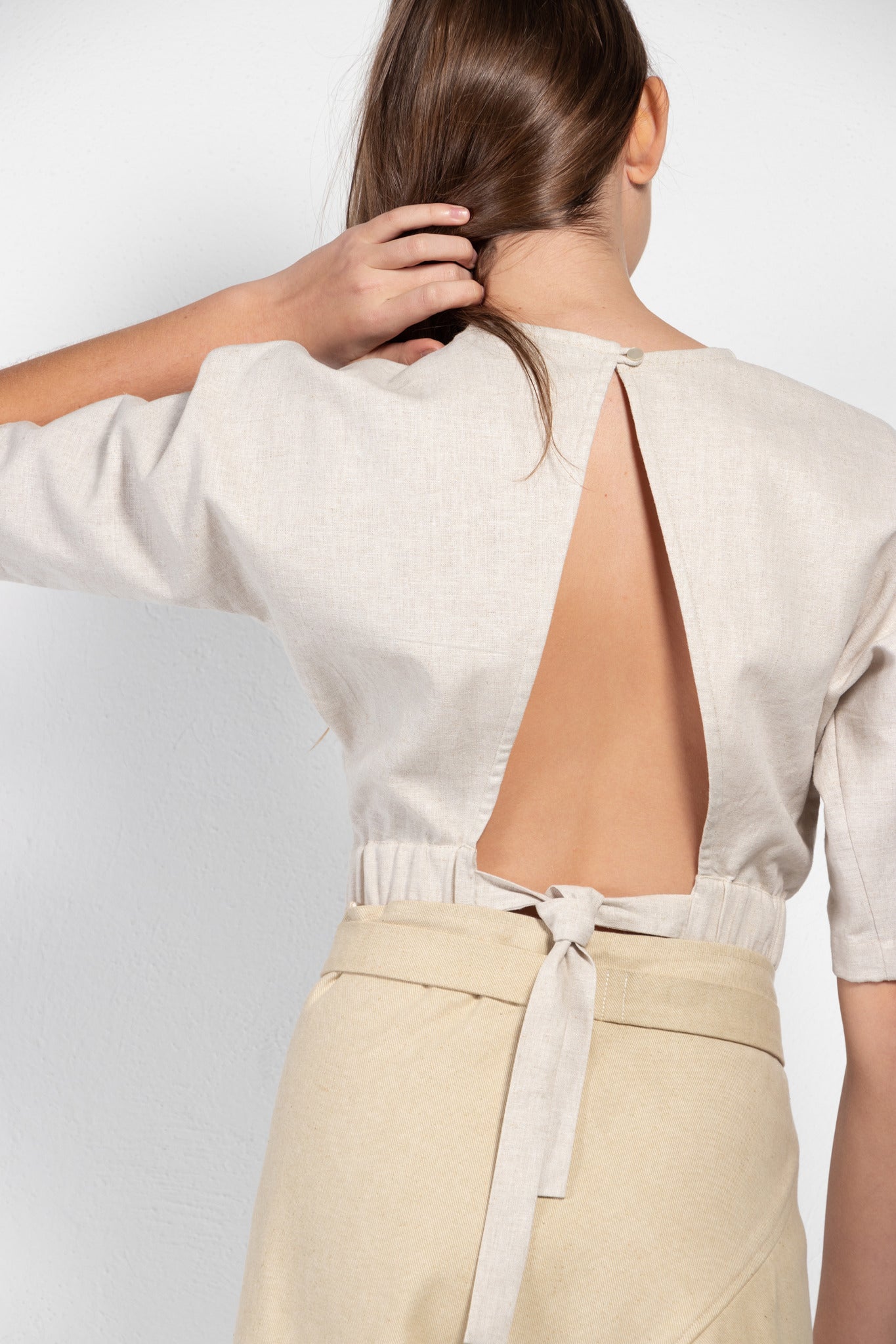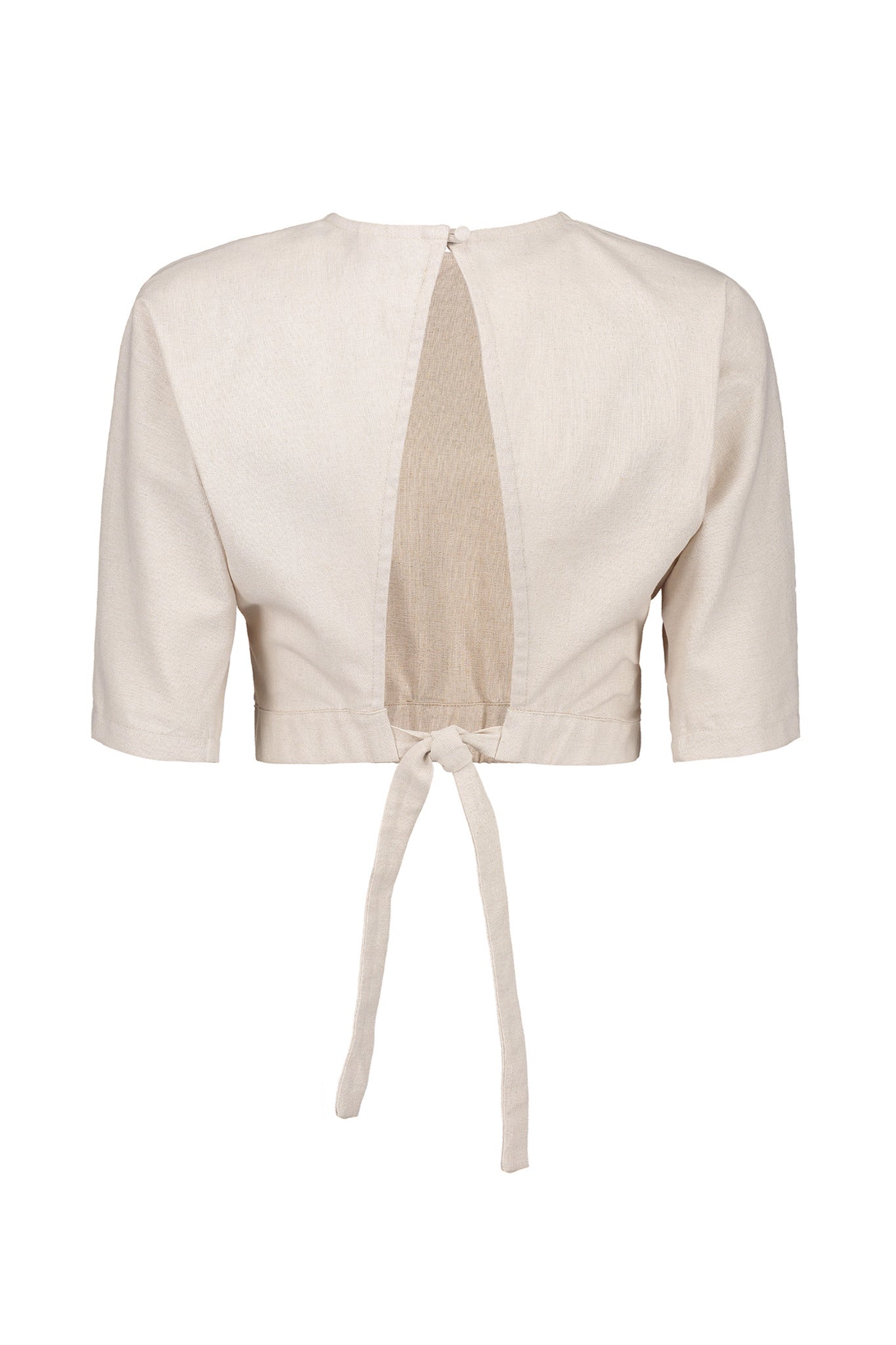 Top corto de lino con espalda abierta y cinturilla elástica que se ata en la espalda