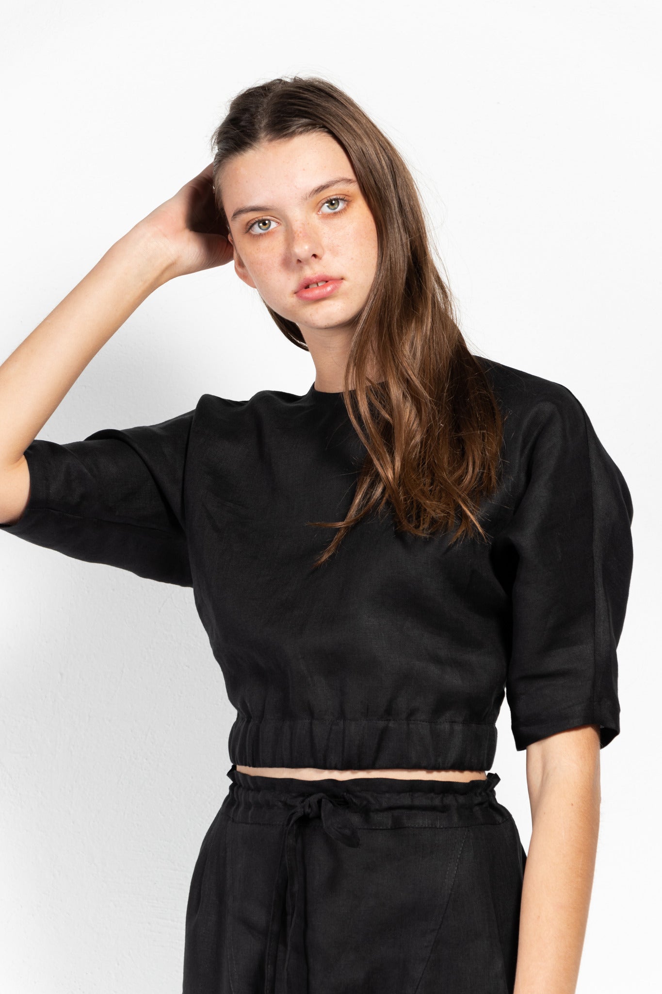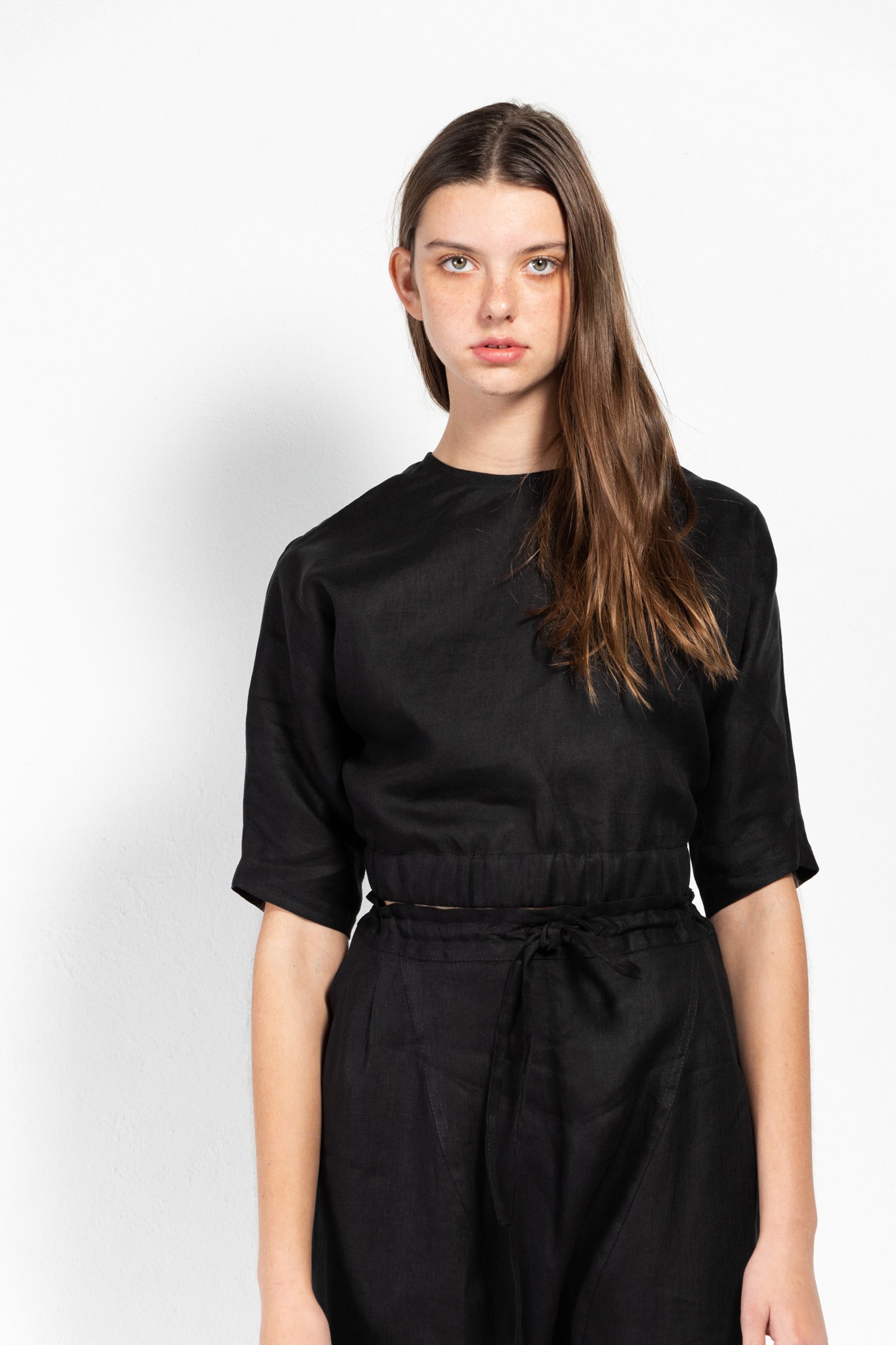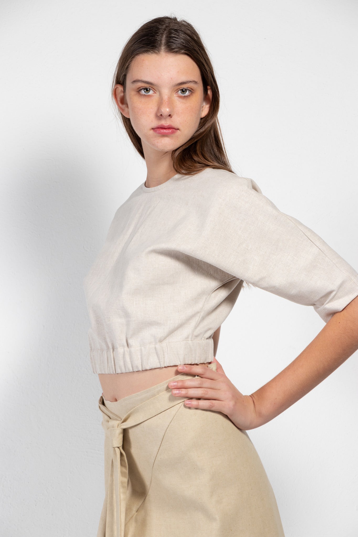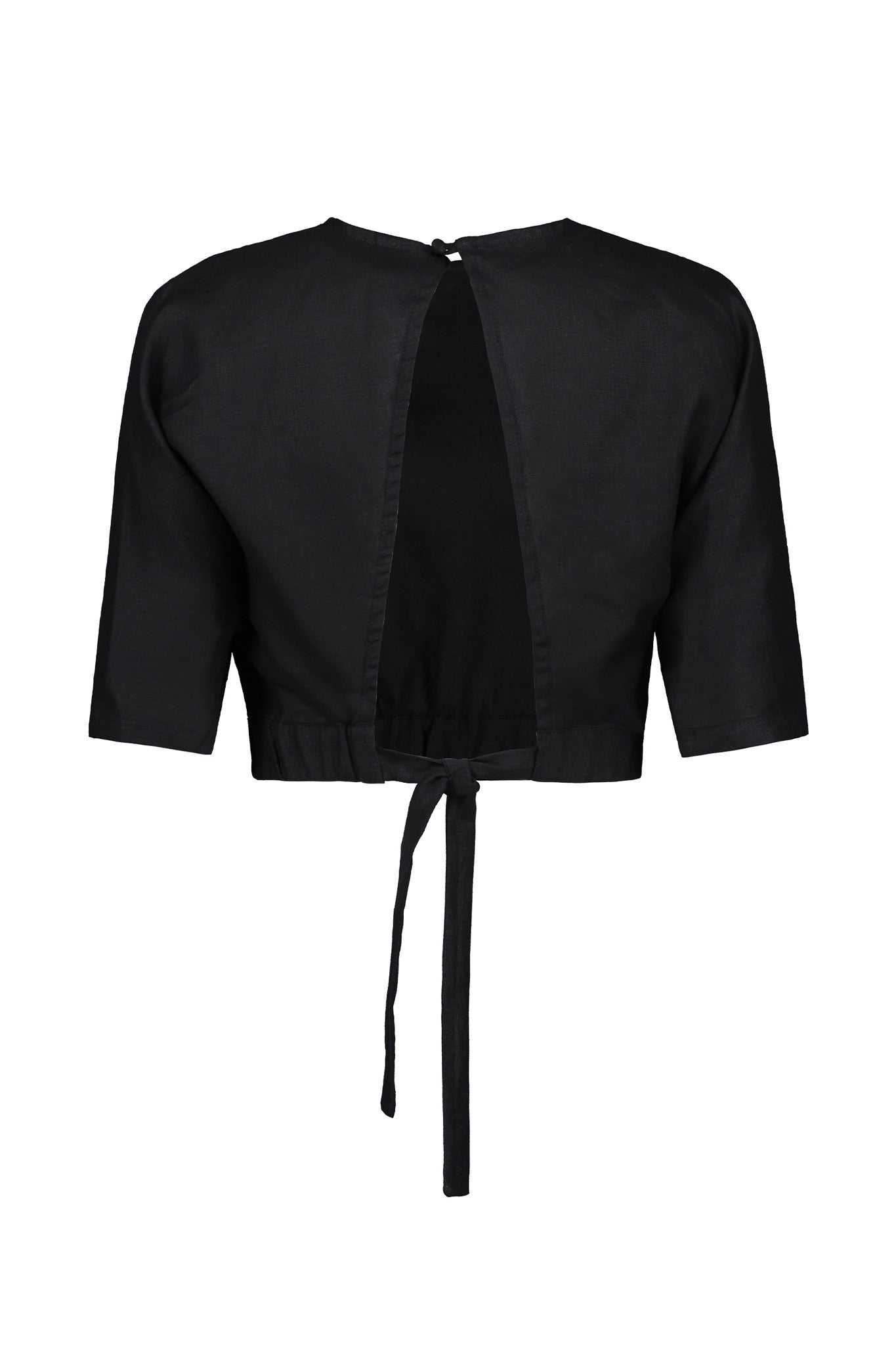 Top corto de lino con espalda abierta y cinturilla elástica que se ata en la espalda