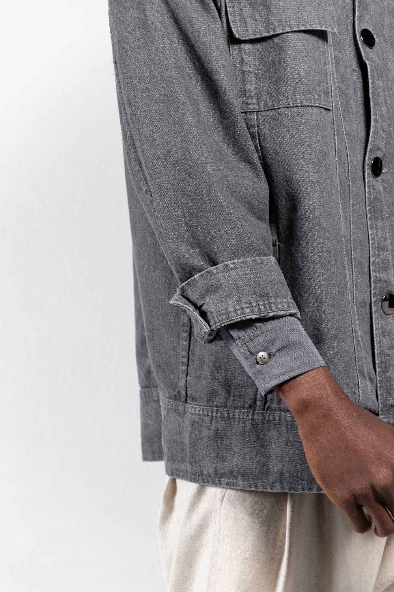 Chaqueta vaquera lavada con botones y pliegues en la parte delantera, cuello en punta, bolsillo con solapa en el pecho y puños con un solo botón