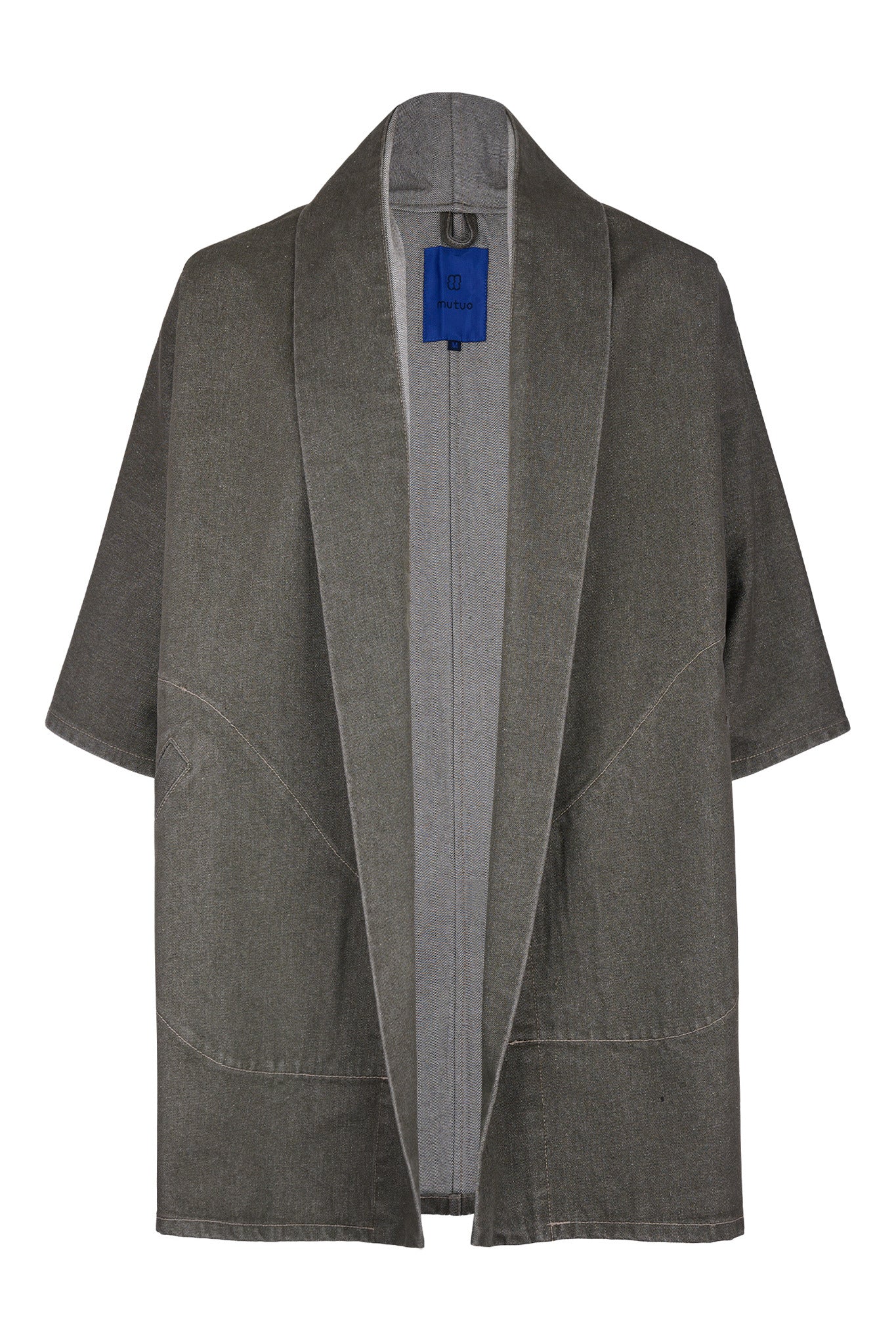 Abrigo kimono de mezclilla verde oliva lavado con bolsillos de ribete delanteros, mangas 3/4 y cuello vuelto