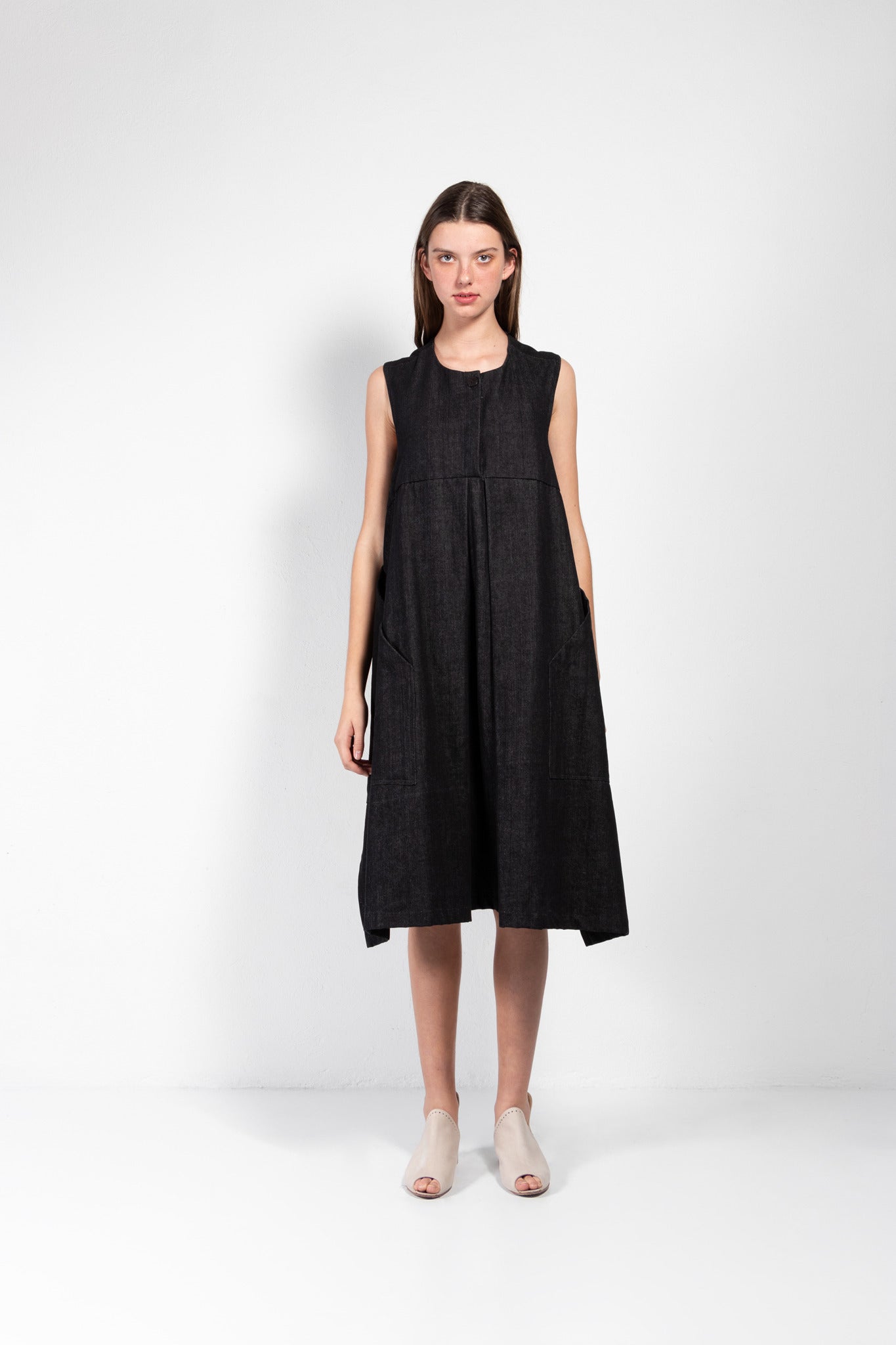 Stand out in this structured, architectural-silhouette denim wrap dress.