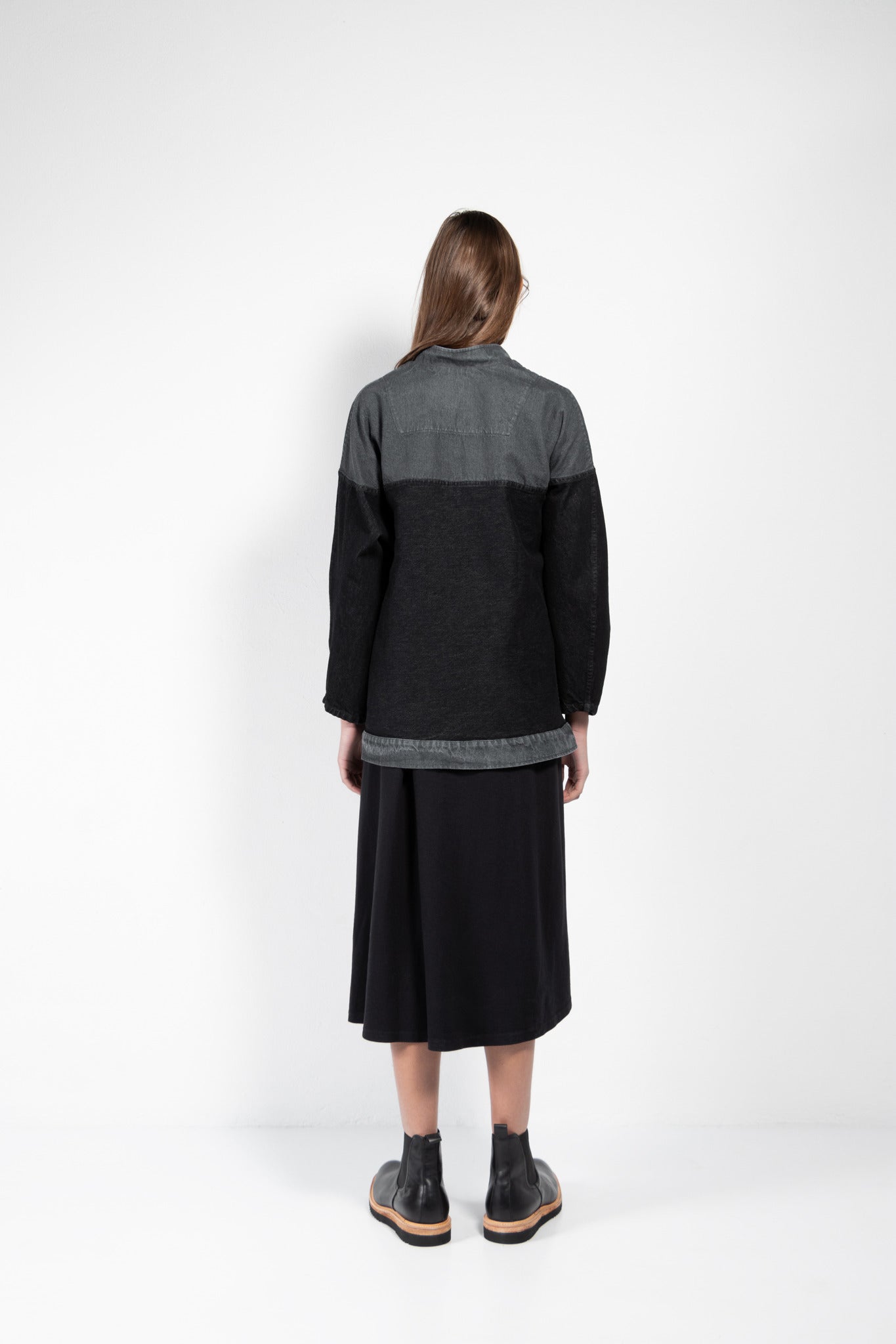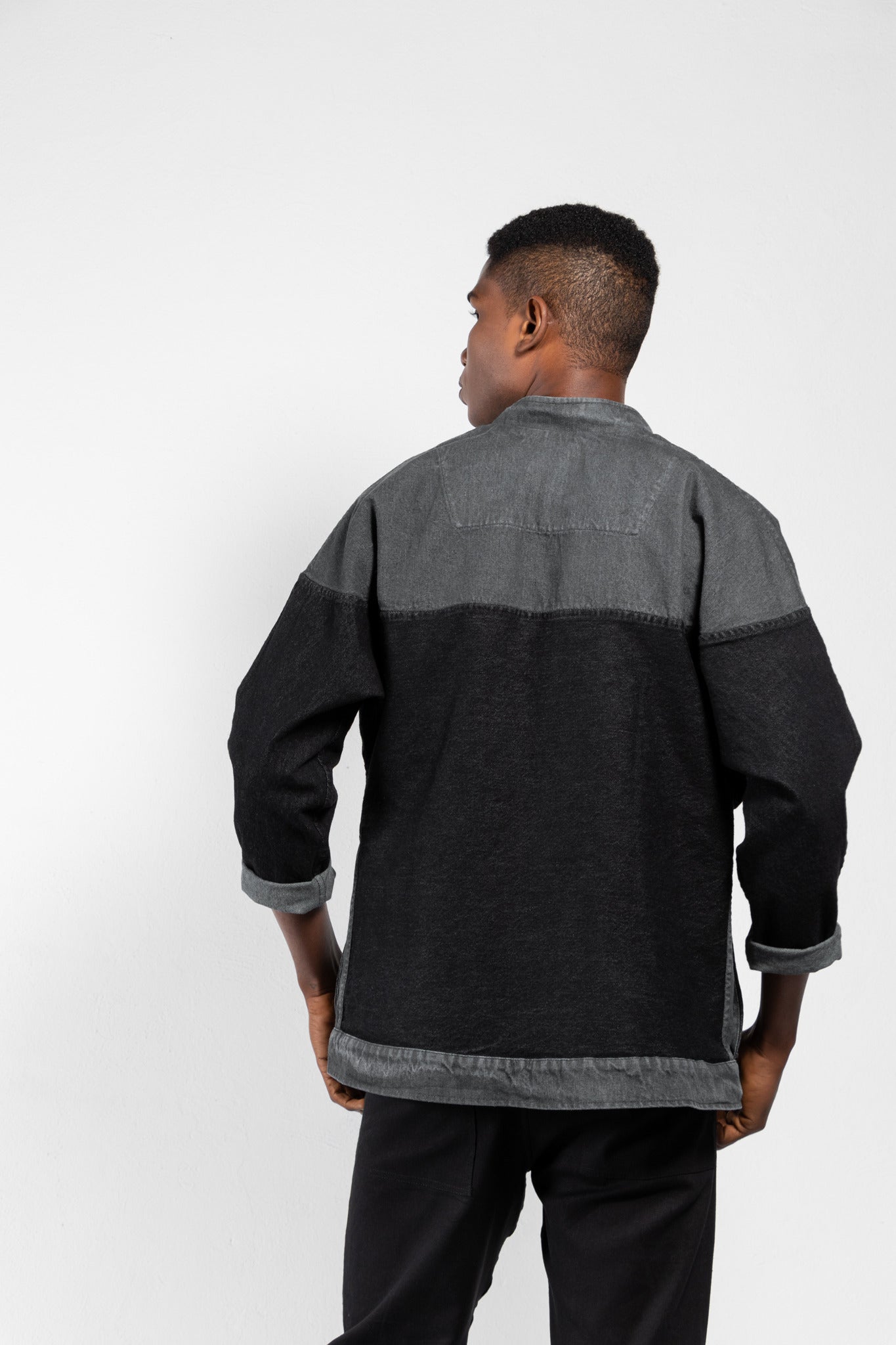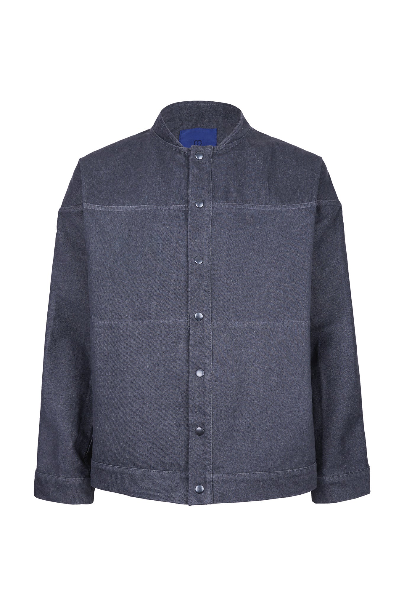 Washed denim jacket with kimono sleeves and yoke that continues from front to back.