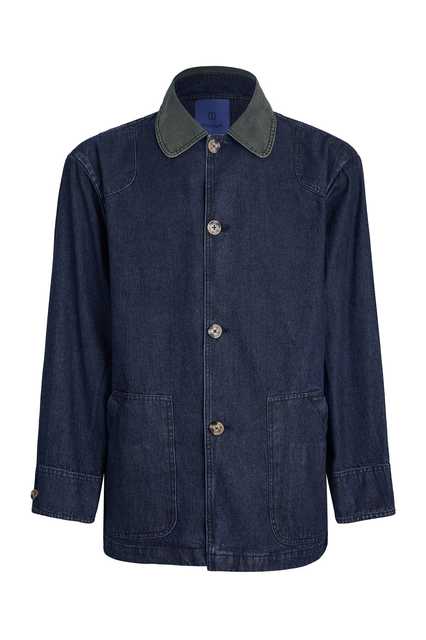 Vintage inspired jacket in a washed denim fabric with a contrasting collar and patch pockets.