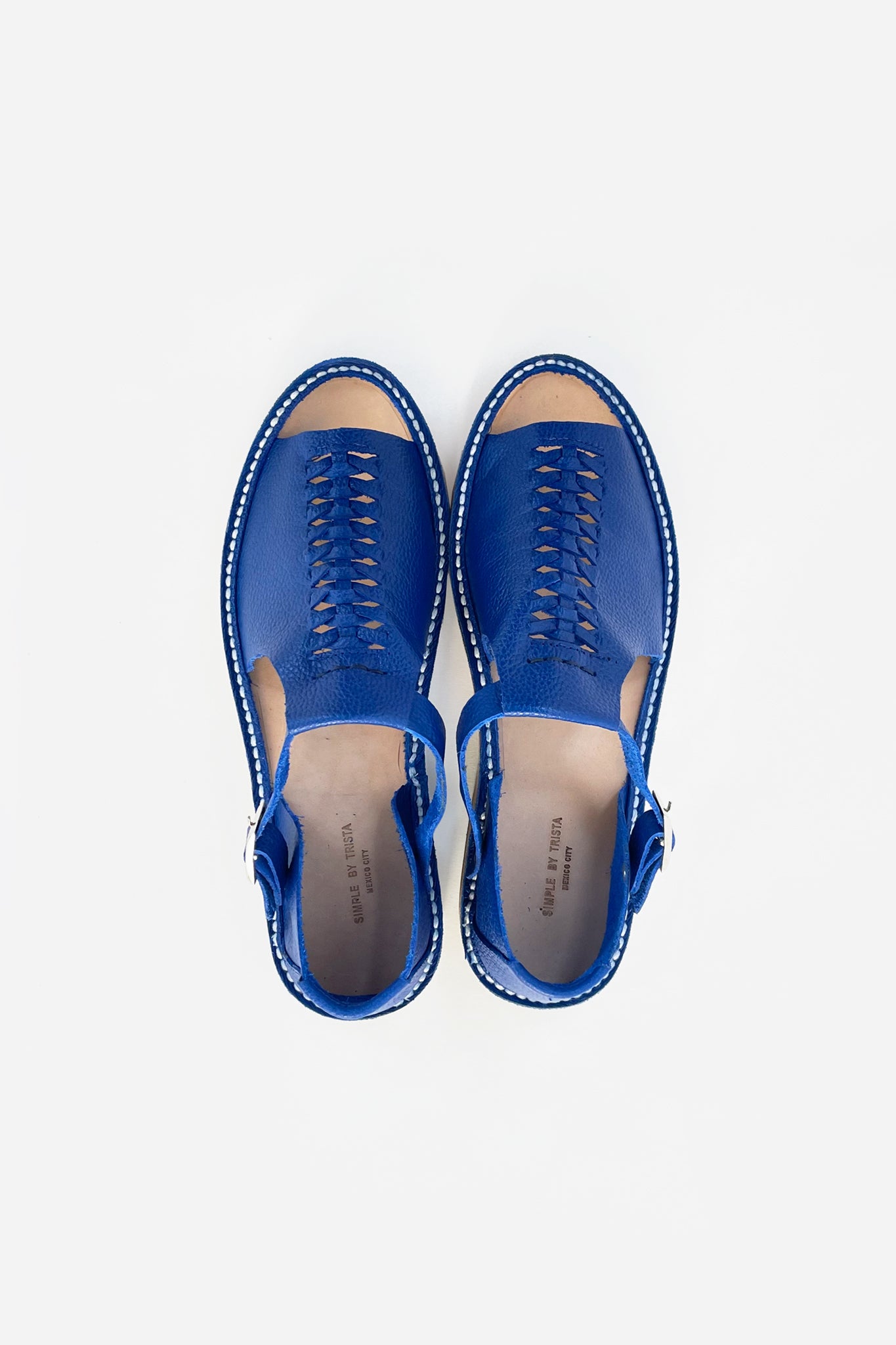 Open, rounded toe sandal in vibrant colored leather with handmade details and an artisanal feel.